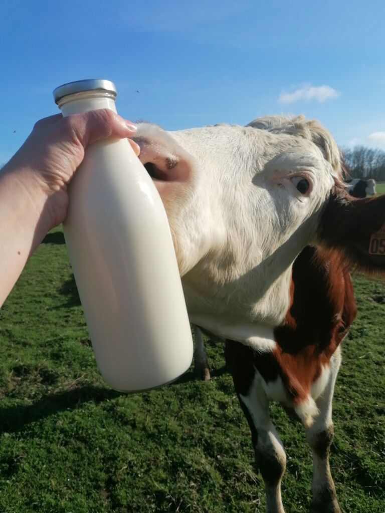 Agriculteurs depuis 7 générations, nous élevons des vaches laitières de race Montbéliarde, réputées pour la qualité de leur lait. Nos animaux profitent d’un accès libre aux prairies toute l’année, donnant au lait un goût unique. Le lait est mis en bouteille sur place et vendu au magasin de la ferme.